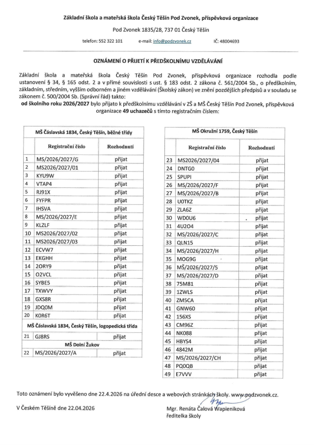Oznámení o přijetí k předškolnímu vzdělávání 2026/2027