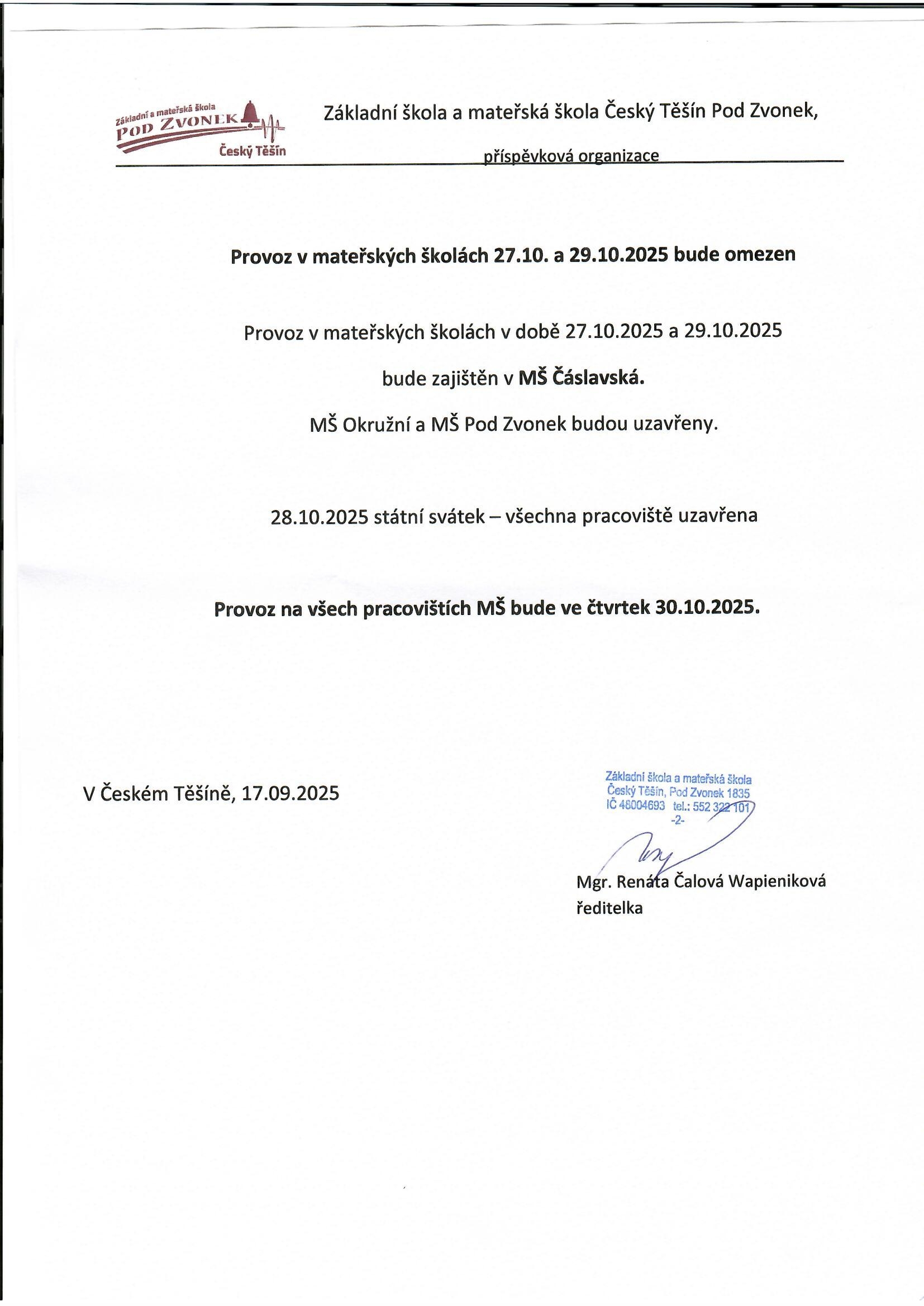 Provoz v době podzimních prázdnin